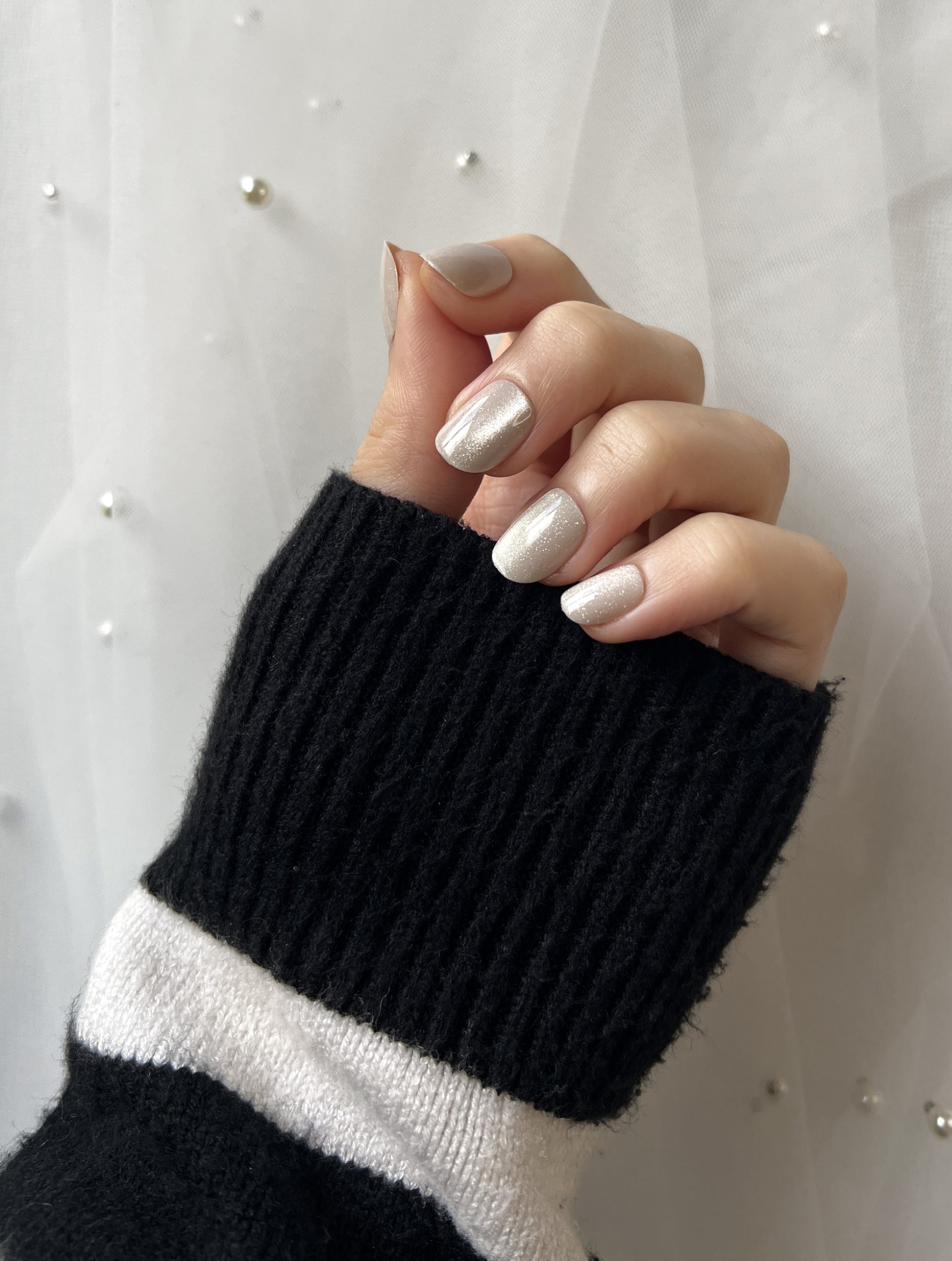 A champagne-beige shimmer with a soft, luminous glow — refined and radiant in every light.