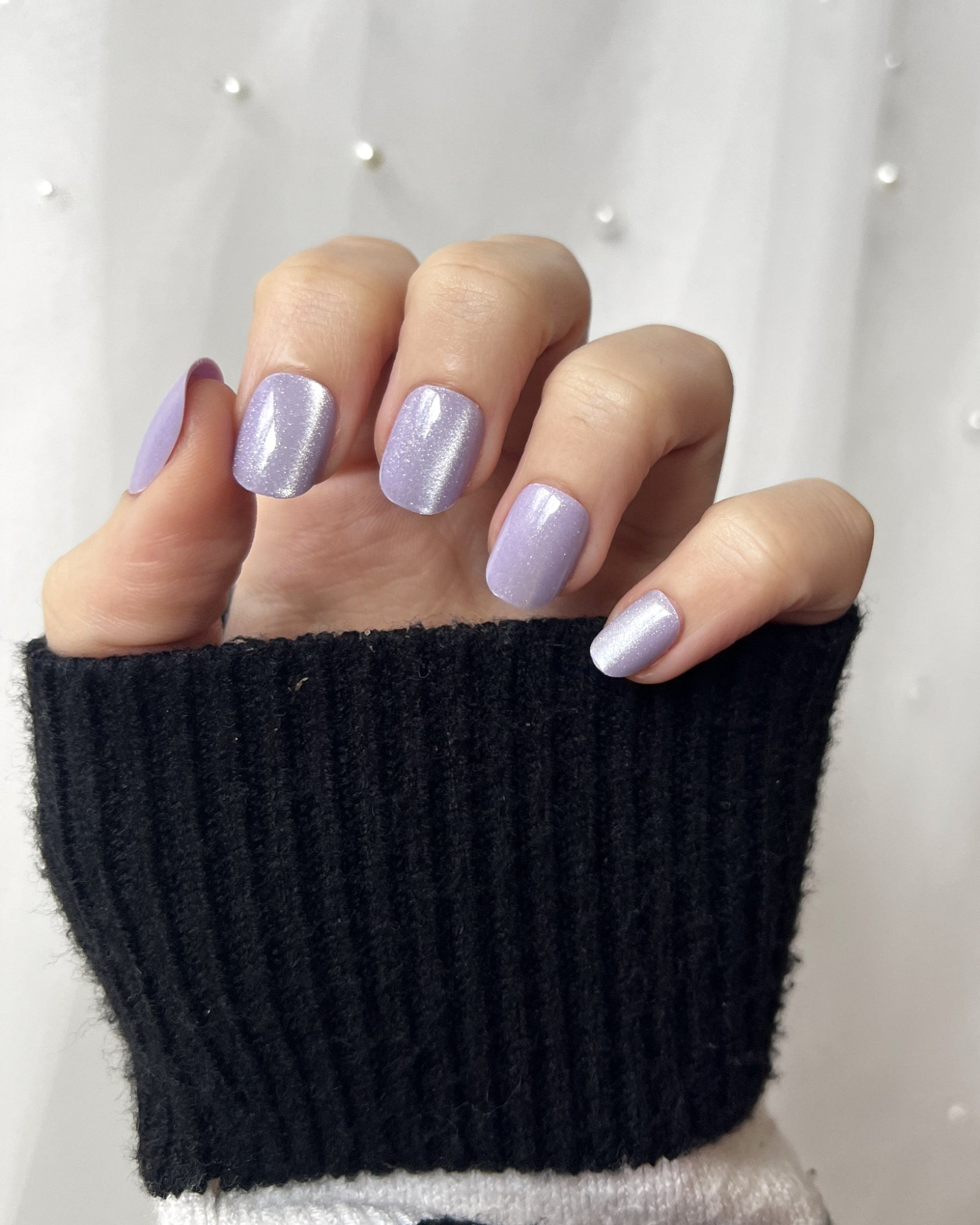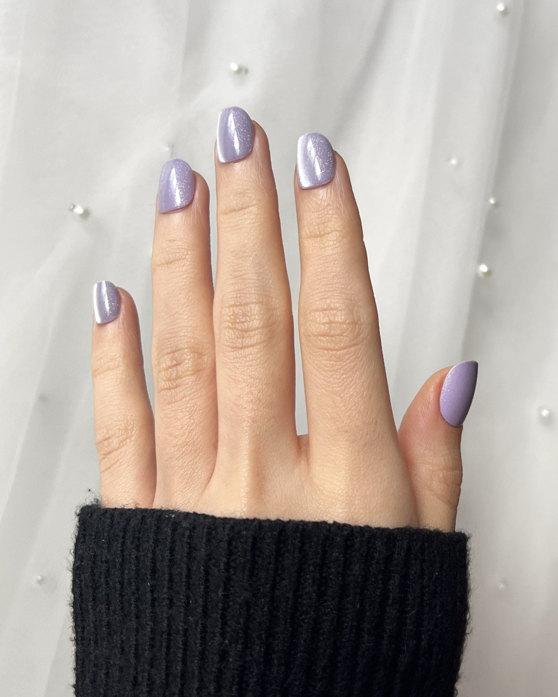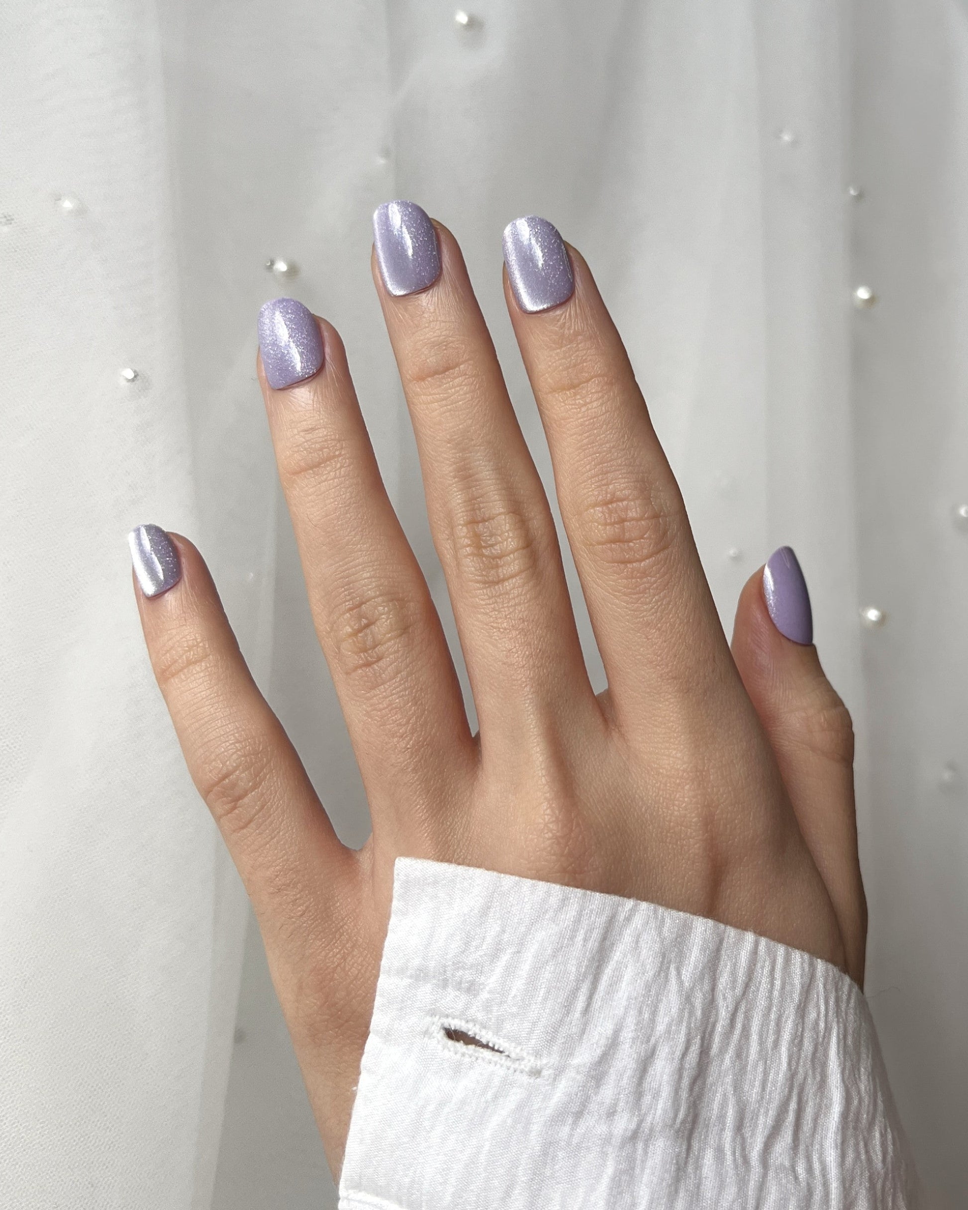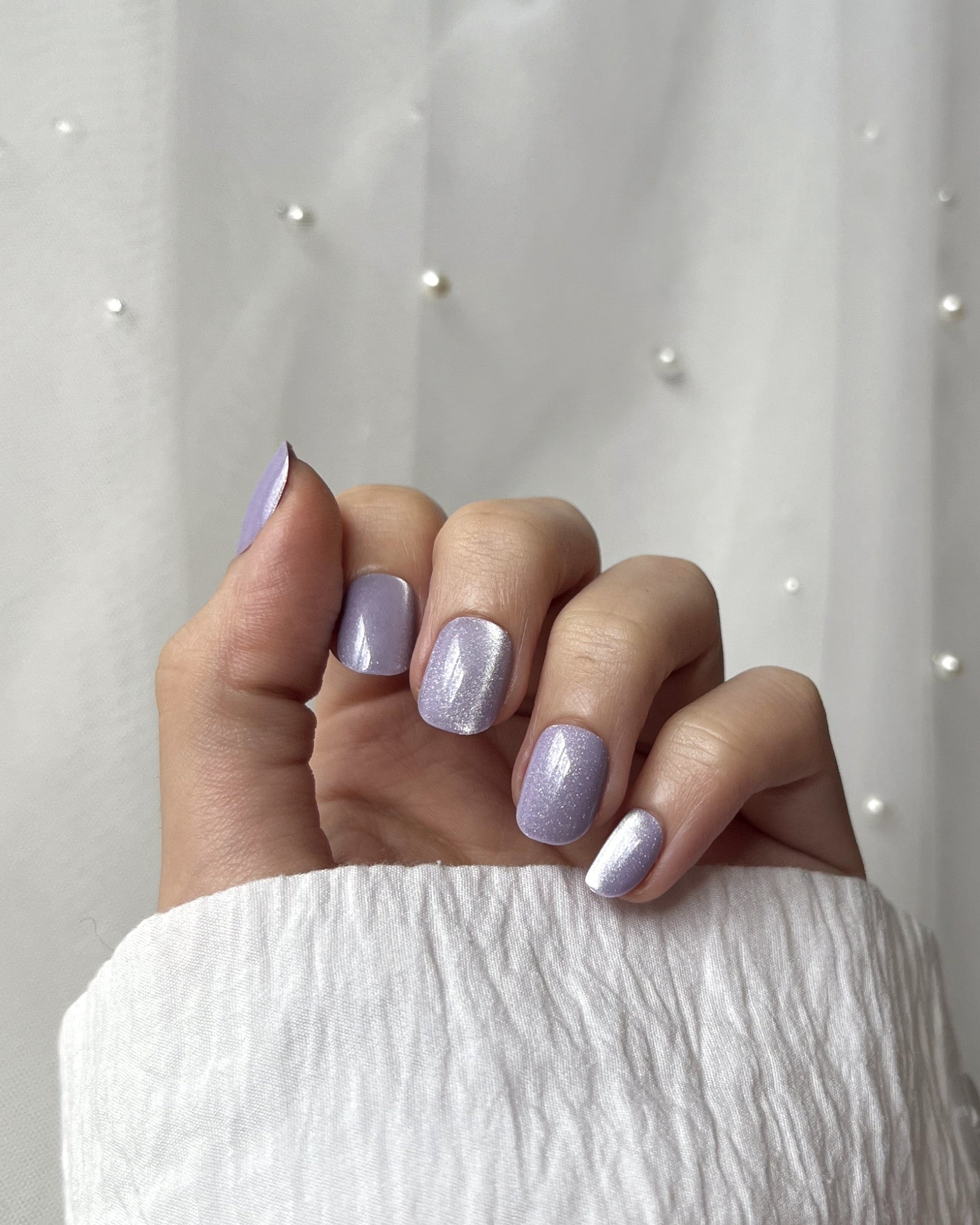 A soft lavender hue kissed with silver shimmer — dreamy, delicate, and effortlessly luminous.