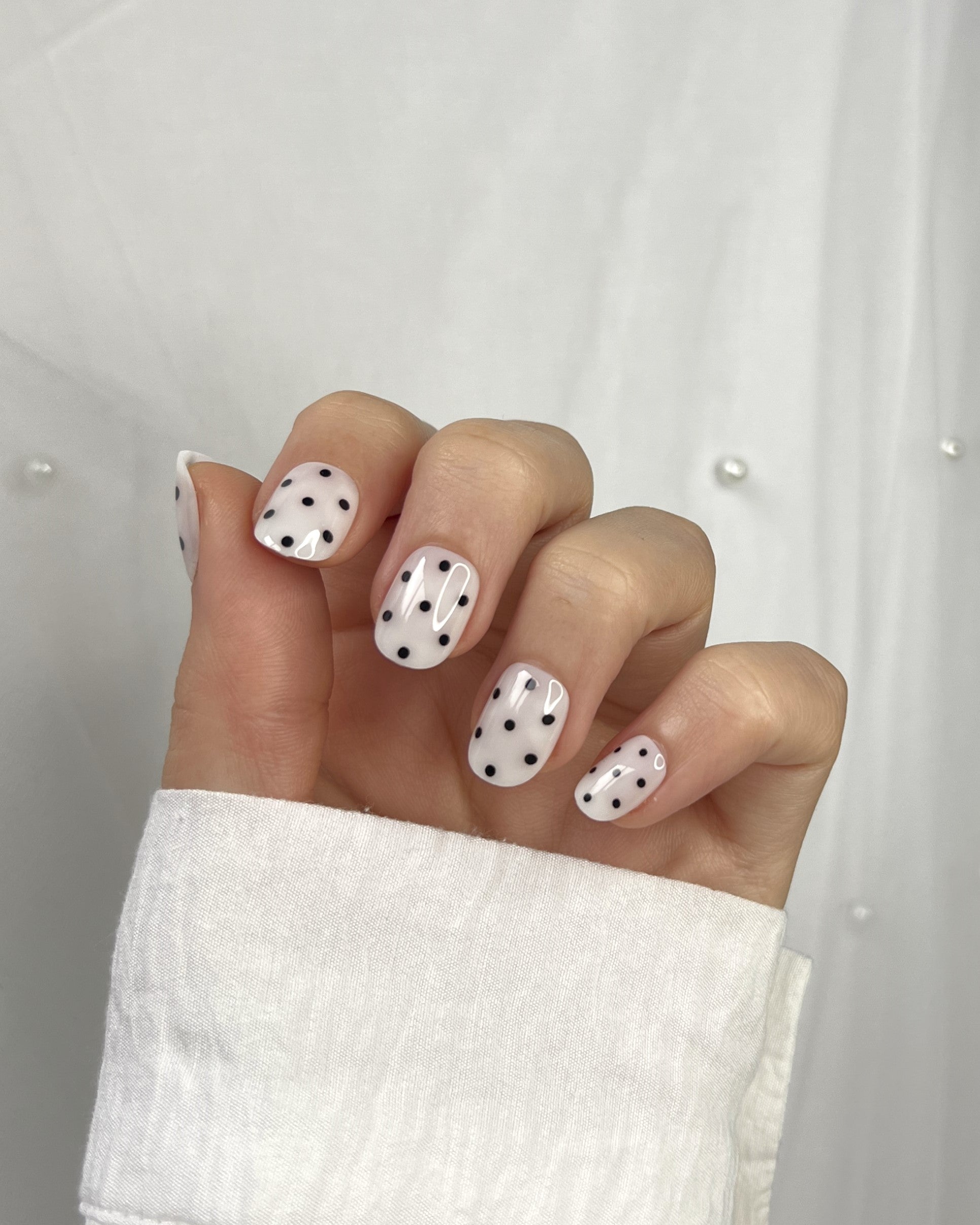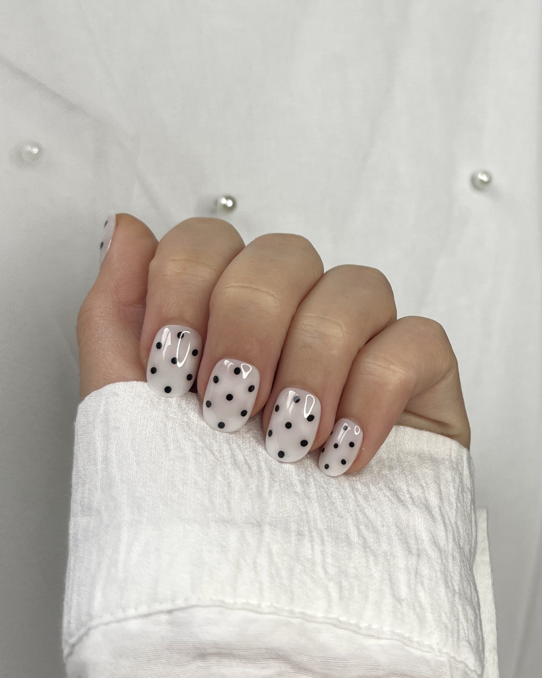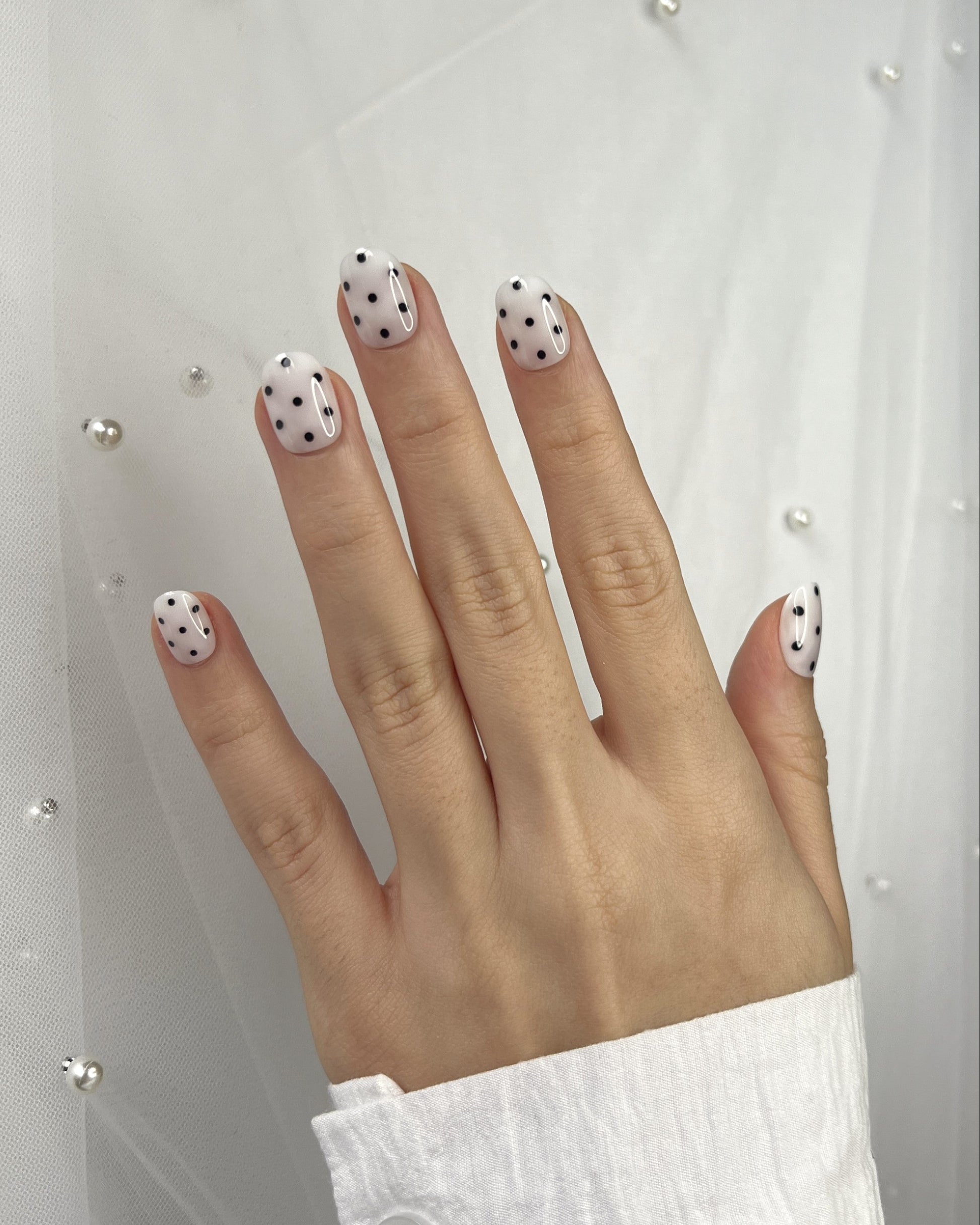 A nude base kissed with soft black dots — playful, modern, and striking in its simplicity.
